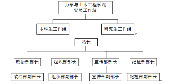 根据工作实际,党员工作站划分为本科生工作组、研究生工作组,每个工作组划分为政治部、组织部、宣传部、纪检部4个部门,设站长1名,每个部门设部长1名、副部长1名。