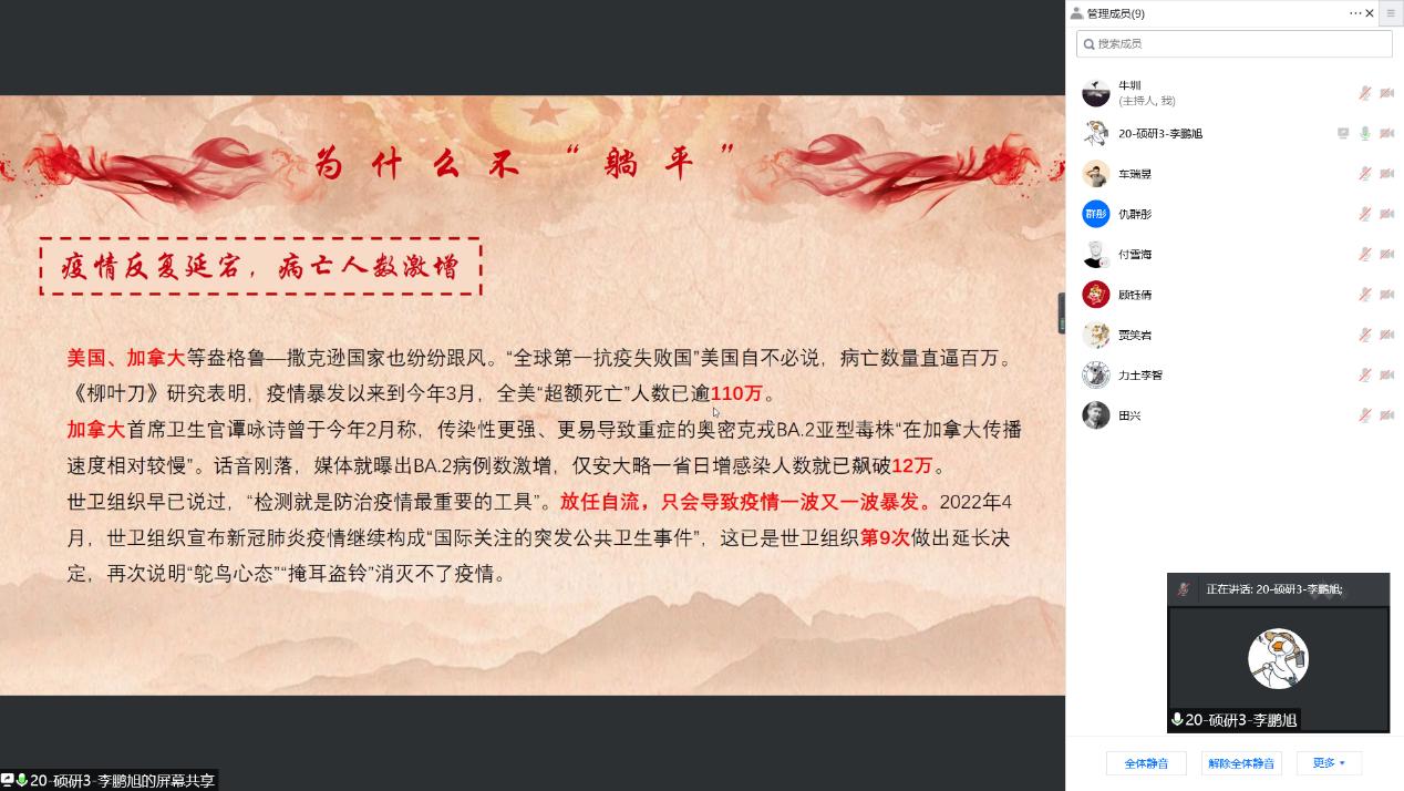 4月28日下午,污污漫画党员工作站联合理论研习社通过线上视频会议的形式开展四月份理论学习活动,本次理论学习系“人文浸润,芳菲四季”系列活动,主题为学习“习近平总书记关于新冠肺炎疫情防控系列重要讲话精神”。会议由研究生党员工作站政治部副部长李鹏旭主持,污污漫画党委副书记李智参与了研讨。