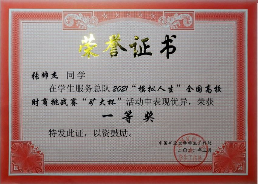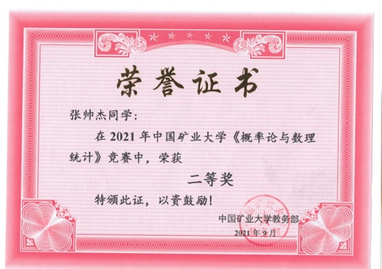 在大一时他的成绩就已位居前列,并获得了校级二等奖学金,但他看到了自己与更优秀的同学之间的差距,意识到只有通过更加刻苦的努力才能获得更大的成就。通过不断丰富理论知识和提升自主学习能力,他的综合成绩在道路与桥梁工程方向排名第一。他还积极参加各类学科竞赛,曾获得财商挑战赛“矿大杯”校级一等奖、概率论与数理统计竞赛校级二等奖、高等数学竞赛校级三等奖等诸多荣誉。经过不懈努力与追求,他还获得了研究生推免资格,现推免至北京航空航天大学道路与铁道工程专业攻读硕士研究生。