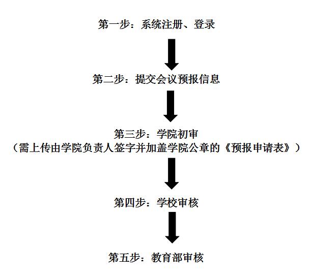 请拟举办会议负责人于2018年11月1日前注册并登陆教育部国际会议报批平台进行预报(//econf.hust.edu.cn/),并上传《会议预报表》(须经二级单位负责人签字并加盖单位公章)。